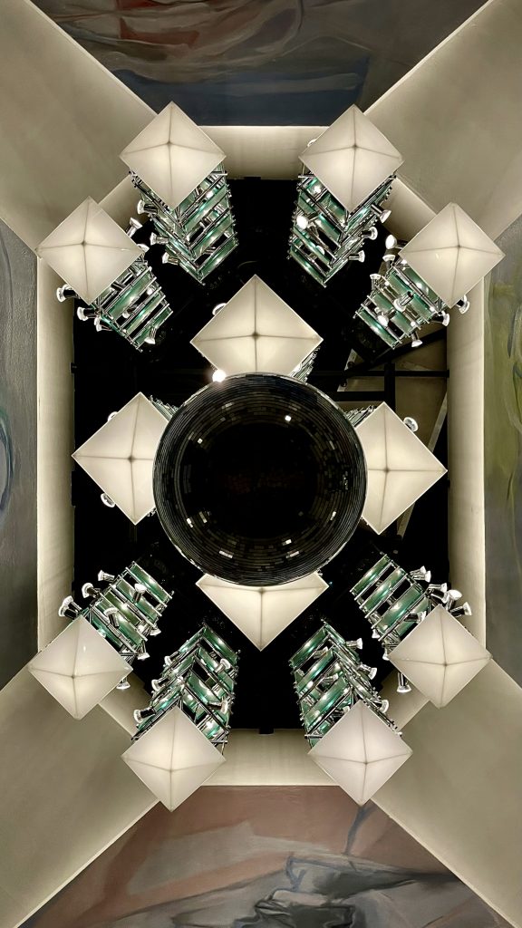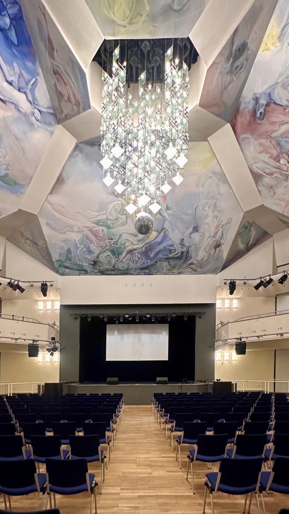 Das Freizeitforum Marzahn (FFM) wurde 1991 eröffnet – geplant noch zu DDR-Zeiten von Wolf-Rüdiger Eisentraut. Nach der Wende stand der Rohbau zur Disposition: Autohaus oder Einkaufszentrum? Statt Abriss entschied man sich für die Fertigstellung. Heute vereint der Komplex Veranstaltungssäle, Schwimmhalle und Sporthalle – ein multifunktionales Konzept als Dienstleistungszentrum und demokratisches Wohnzimmer zugleich. Herzstück ist der Arndt-Bause-Saal: Seine oktogonal gefaltete Deckenkonstruktion prägt nicht nur die Akustik, sondern rahmt auch das rund 400 Quadratmeter große Deckengemälde „Der Morgen, der Tag, der Abend, der Traum“. Relikte wie der Kronleuchter oder auch Scheinwerfer aus dem Palast der Republik bewahren eine seltene Geschlossenheit ostdeutscher Raumkunst.