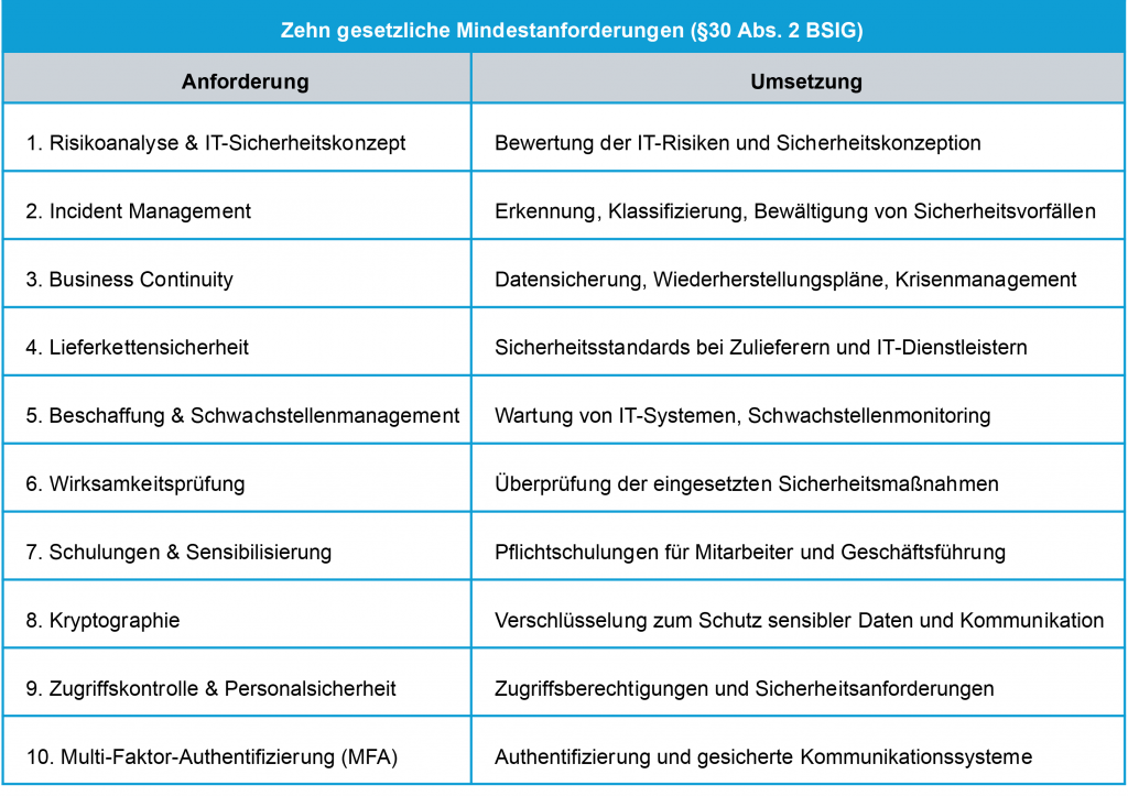 Was das konkret bedeutet: Schulungspflicht für die Geschäftsführung, dokumentiertes Risikomanagement nach zehn gesetzlichen Mindestanforderungen, ein funktionierender Meldeprozess für Sicherheitsvorfälle mit Fristen von 24 Stunden, 72 Stunden oder einem Monat. Ein Konzept auf dem Papier schützt nicht, sondern nur die belastbare Nachweisbarkeit im Prüfungsfall. Die Umsetzung verlangt strukturierte Prozesse, die weit über technische Einzelmaßnahmen hinausgehen.